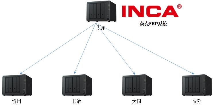 五個分公司各采購一臺DS918+,以太原為中心,向其它分公司的DS918+進行數(shù)據(jù)實進下發(fā)(單向),同時太原中心的存儲與英克ERP進行了集成(JAVA二次開發(fā)),這樣,ERP的業(yè)務(wù)數(shù)據(jù)將自動存儲到DS918+的文件夾,隨后下發(fā)到其它分公司。